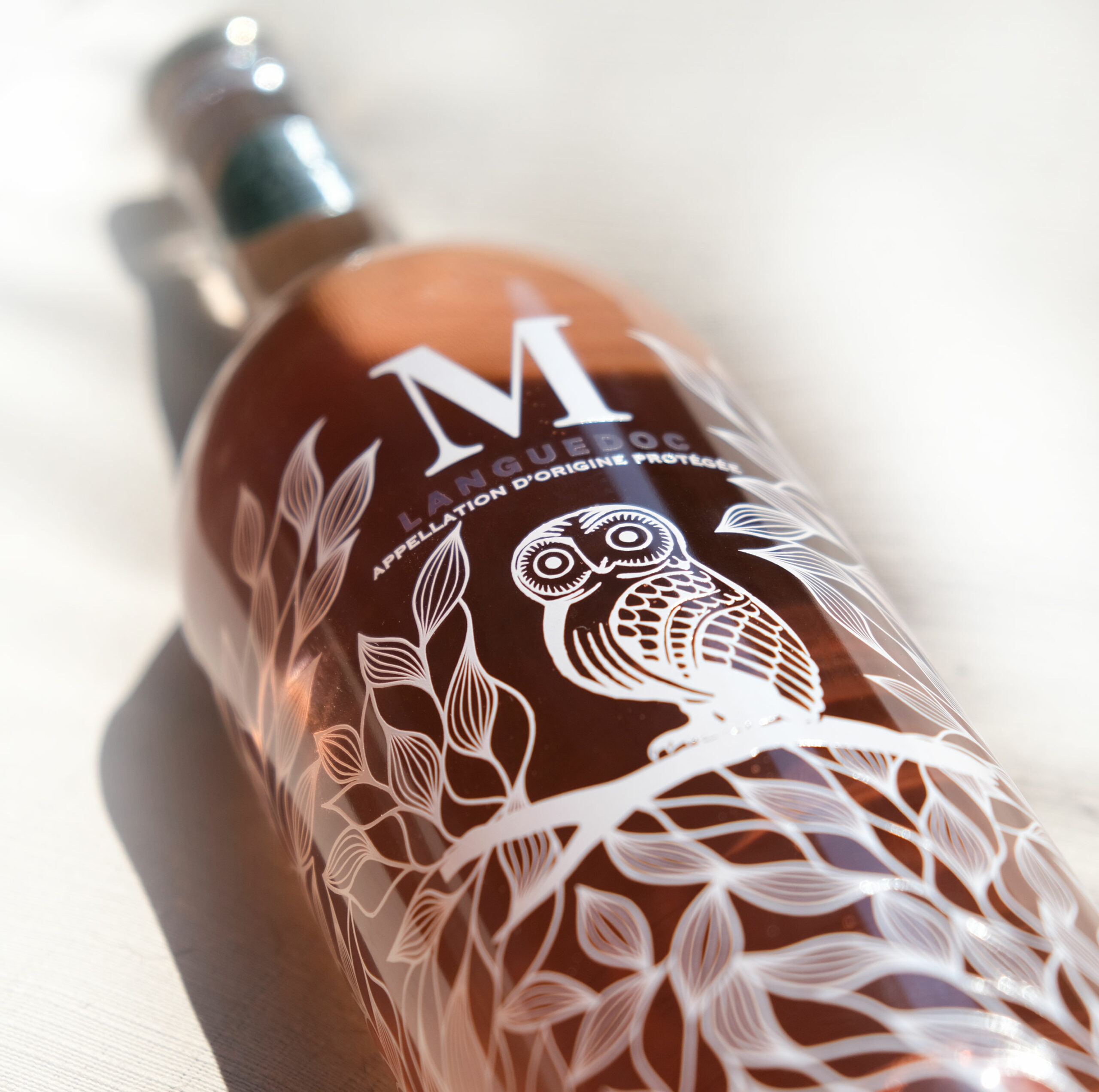 Lorsque Cordier nous a demandé de réfléchir à l’habillage de la cuvée haut de gamme de la marque Mythique, nous l’avons baptisée M spontanément. M pour Mythique, Magnifique, Majestueuse, Merveilleuse… M pour le Maintien de la biodiversité, M pour la protection du Milieu naturel. Et c’est bien là ce qu’il s’agissait de traduire : une chouette mythique, inlassable gardienne de la nature, émissaire du bon sens. Nous l’avons posée dans un arbre imaginaire magnifié par une sérigraphie blanche pour qu’elle nous rappelle avec bienveillance et sagesse la force du lien qui lie chaque être vivant à la nature.
