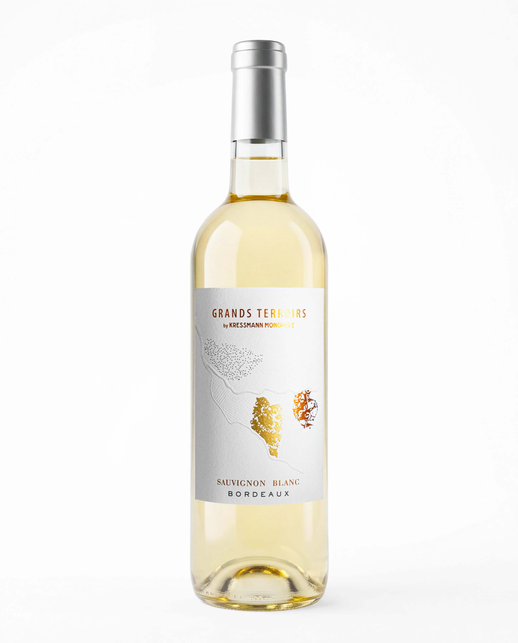 Retour sur une créa de 2024 ! Kressmann nous avait confié l’habillage d’un sauvignon pour le marché allemand. Une cuvée censée mettre en valeur les meilleurs terroirs de ce cépage. Les sols argilo-calcaires et argileux de l’Entre-Deux-Mers, et les terroirs sableux situés au nord de Bordeaux, sont suggérés par de délicats aplats de dorure. On adore le travail de galbe sur les deux rivières et les parcelles !