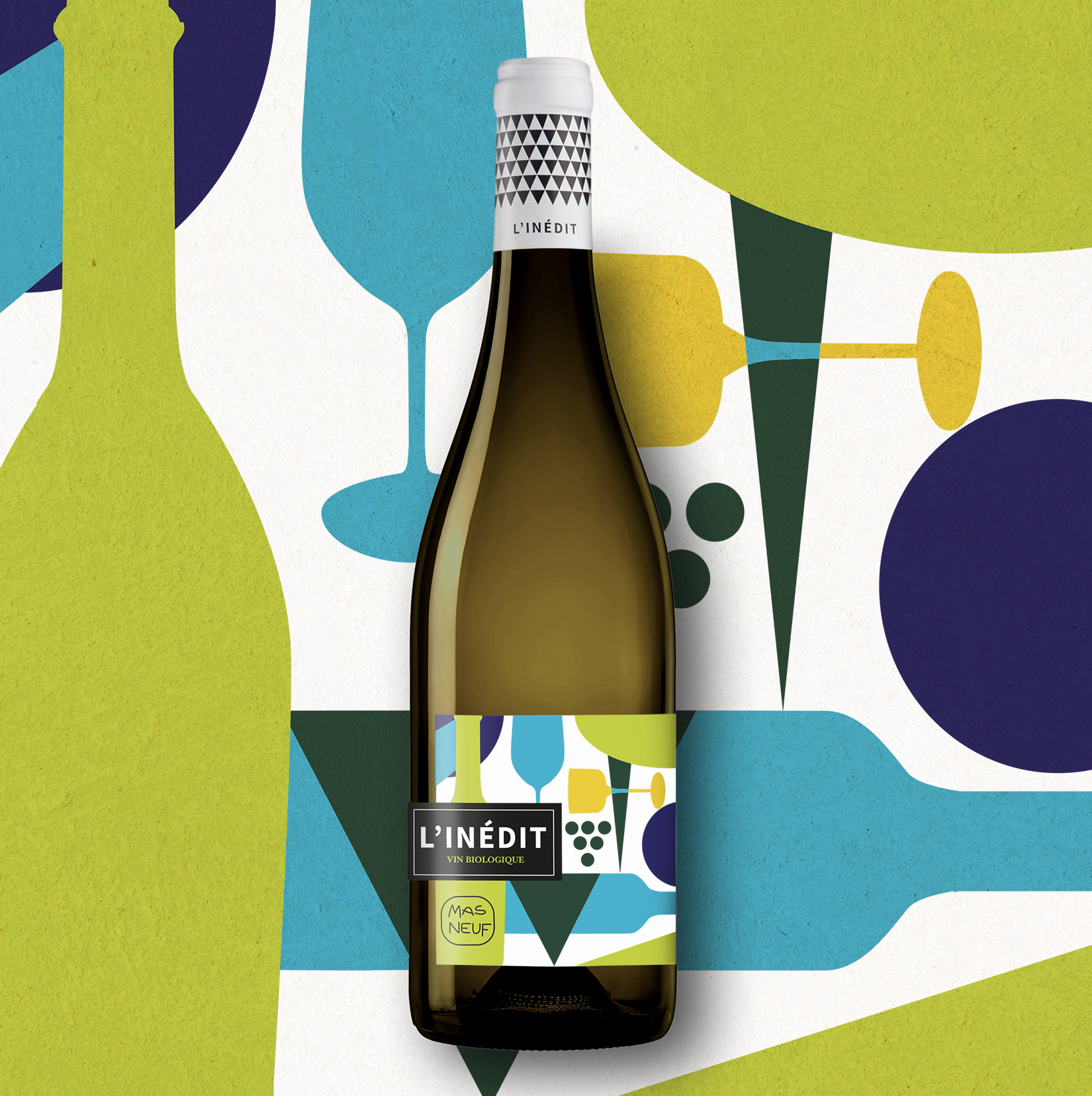Nouvelles robes colorées pour L’inédit, cuvée de notre client Vignobles Jeanjean. Les habillages vifs et frais se marient aux arômes tropicaux et aux notes florales de ce Pays d’Oc.